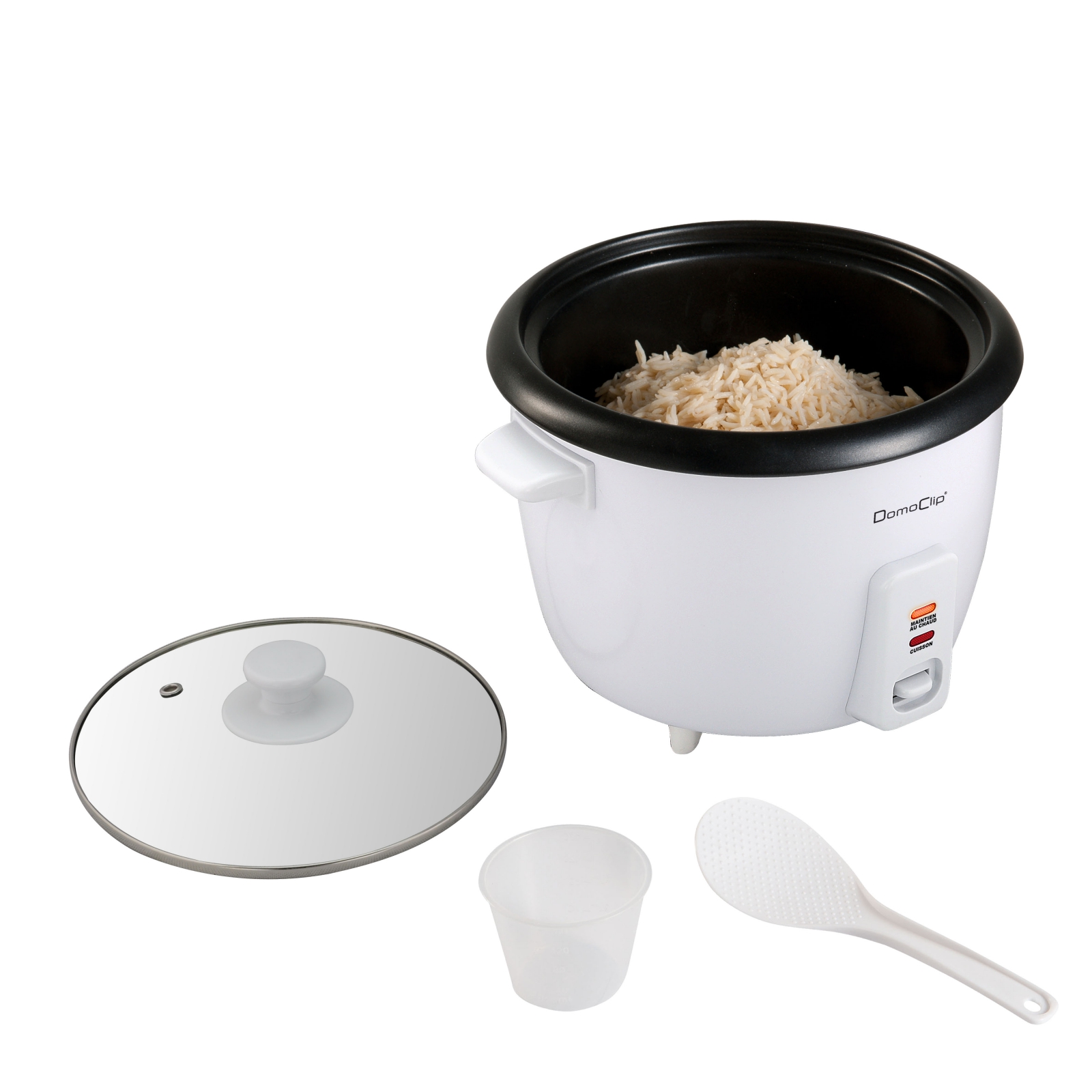 Cuiseur à riz et vapeurCuiseur à riz, capacité de 1,5 L, panier en aluminium revêtement teflon, fonction maintien au chaud, couvercle transparent avec évaporateur, indicateur de niveau, bouton lumineux marche/arrêt, protection surchauffe, bouton marche/arrêt à l’arrière, livré avec un bol doseur, et une cuillère à rz Marque Domoclip Garantie 12 mois